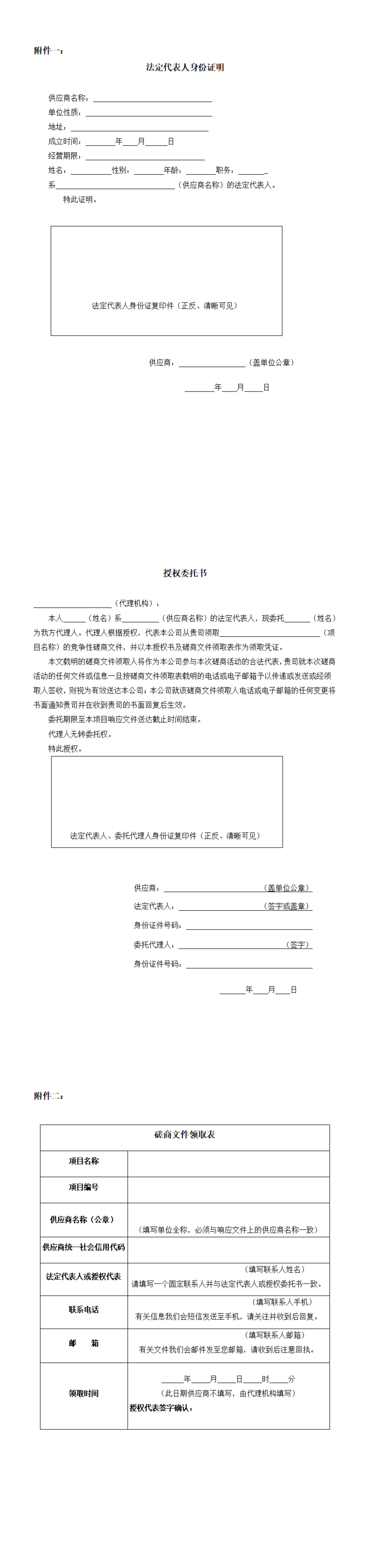 3.1法定代表人自己领取的,凭法定代表人身份证明书原件及法定代表人身份证原件、法定代表人在投标单位(报名截止时间前推十二个月)任意连续三个月的社保证明材料领取;法定代表人委托他人领取的,凭法定代表人授权书原件及受托人身份证原件领取、委托人必须为投标单位在职正式职工(报名截止时间前推十二个月)任意连续三个月的社保证明材料领取;(格式见公告末尾链接附件一)